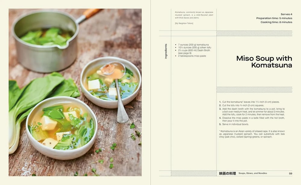 Organized by type of dish—dumplings, noodles, soups, and stews; seafood; eggs and meat; vegetables and rice; desserts and tea—it offers concise and beautifully illustrated recipes that will satisfy practiced and novice cooks alike. Scattered throughout are descriptions of the films that inspired each dish—a selection as varied as the recipes themselves that include classics, cult, and anime: Midnight Diner, Toilet, Spirited Away, Little Forest, Makanai, My Neighbor Totoro, What Did You Eat Yesterday?, Our Little Sister, Samurai Gourmet, Voyage to Tokyo, The Asadas, Kamome Diner, The Way of the Hot and Spicy, The Garden of Words, Every Day a Good Day, Sweet Bean, Kantaro.